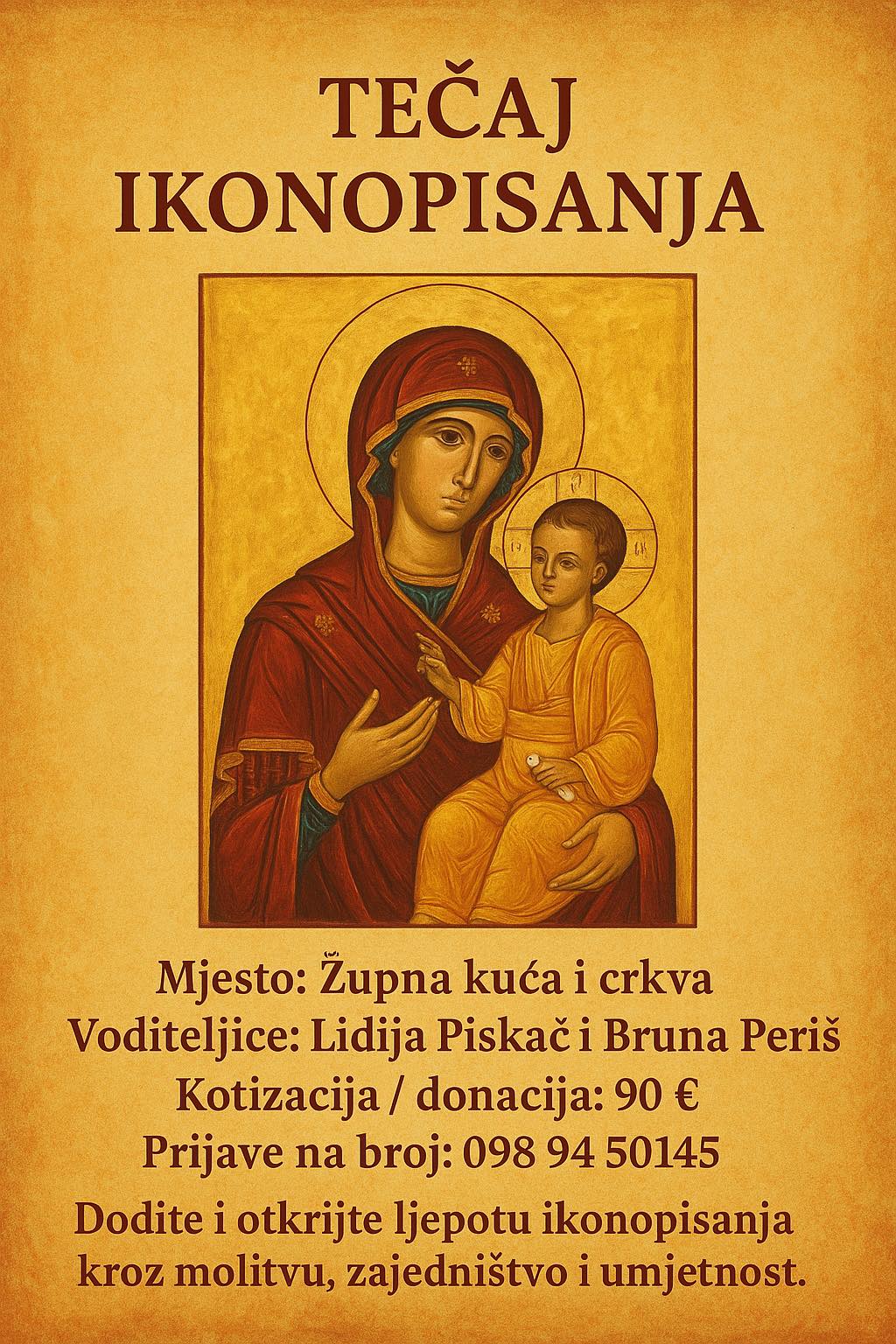 Tečaj je prilika da sudionici zakorače u svijet svetih ikona, učeći o njihovom duhovnom i umjetničkom značenju, te kroz osobni rad dožive molitvenu dimenziju stvaranja.