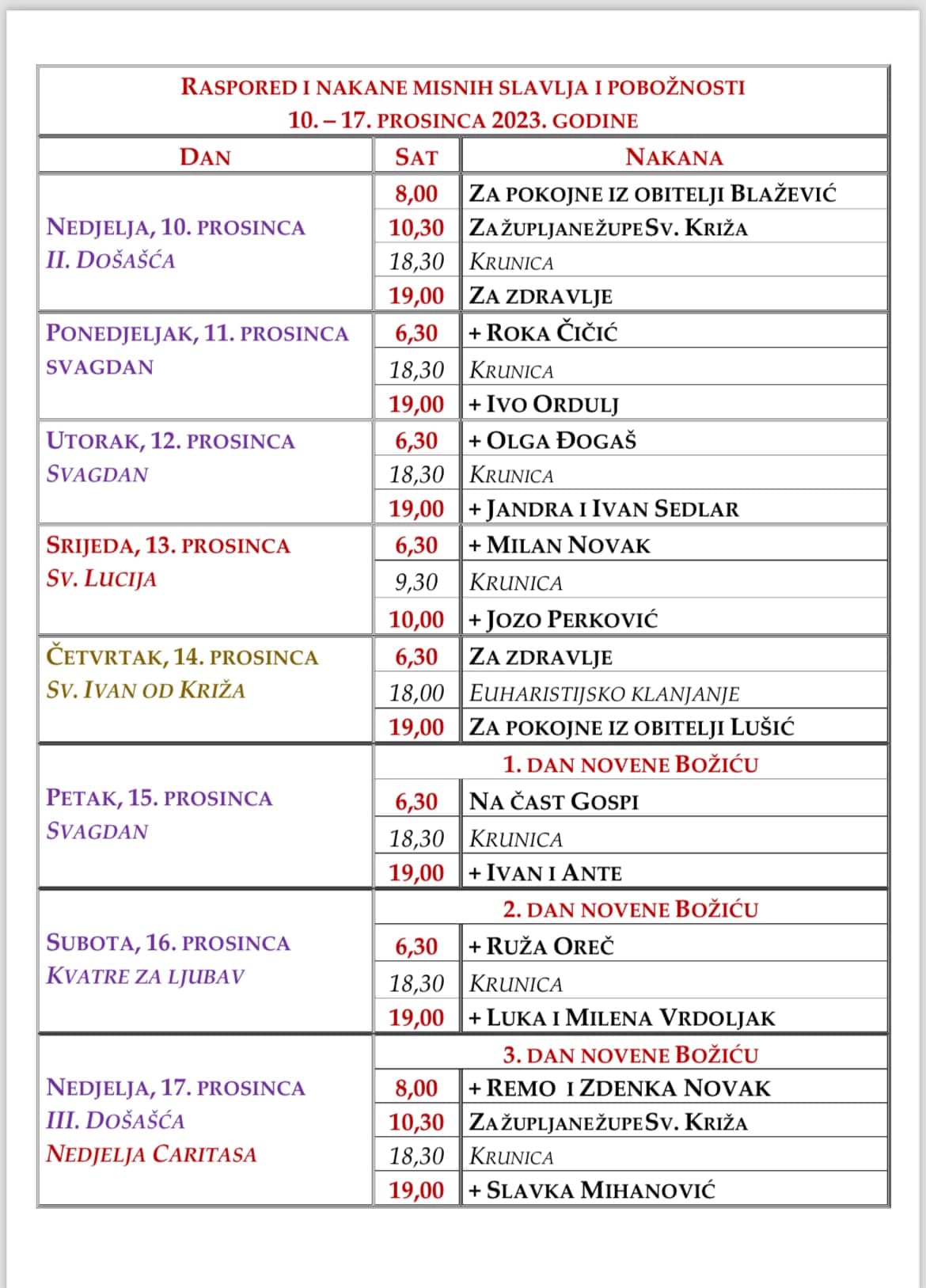 TJEDNI RASPORED I NAKANE – II. DOŠAŠĆA – ZORNICE/BOŽIĆNA NOVENA – [10. – 17. prosinca 2023.]